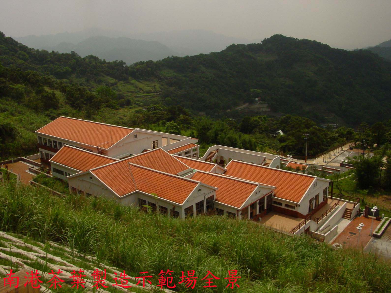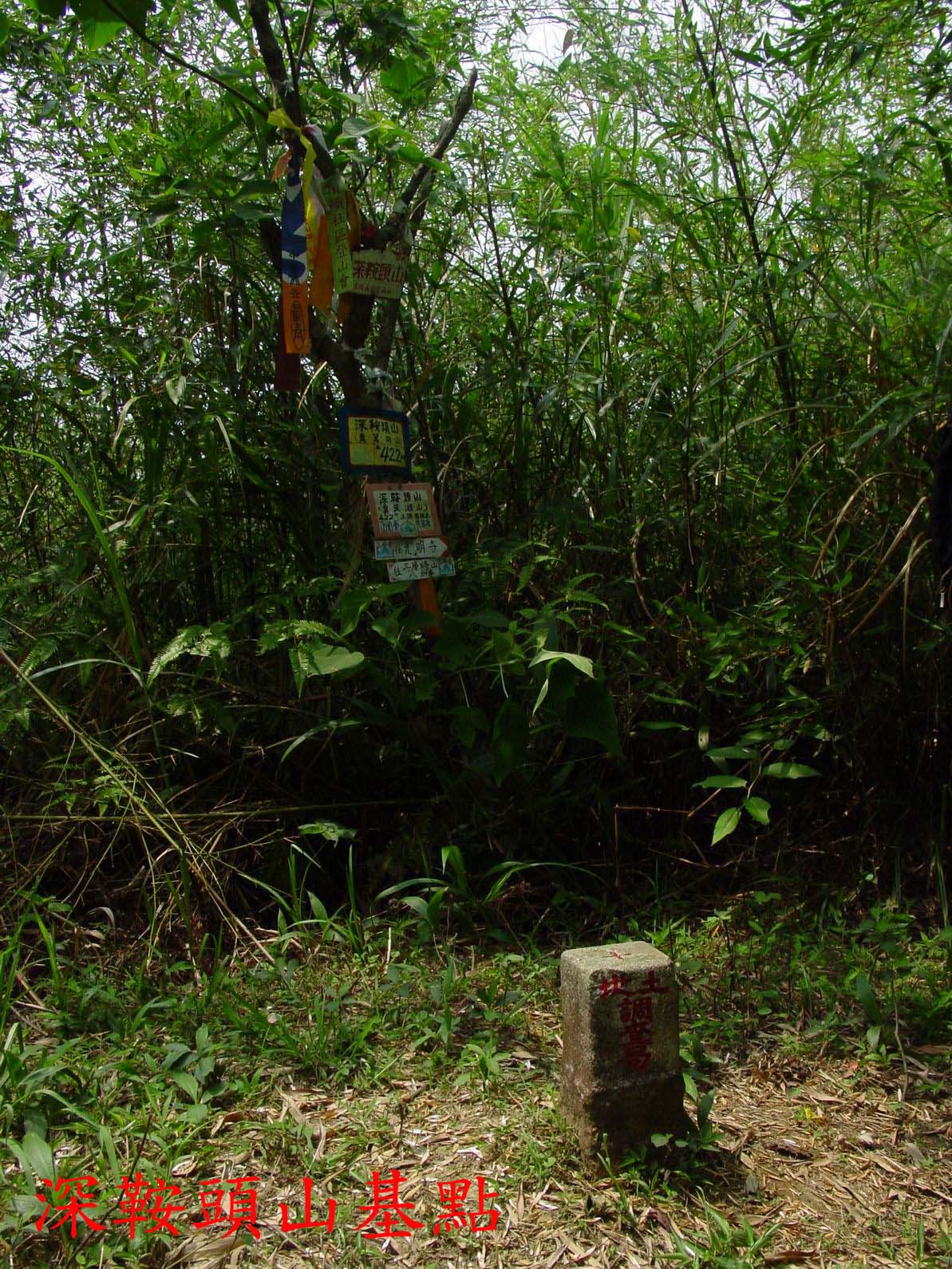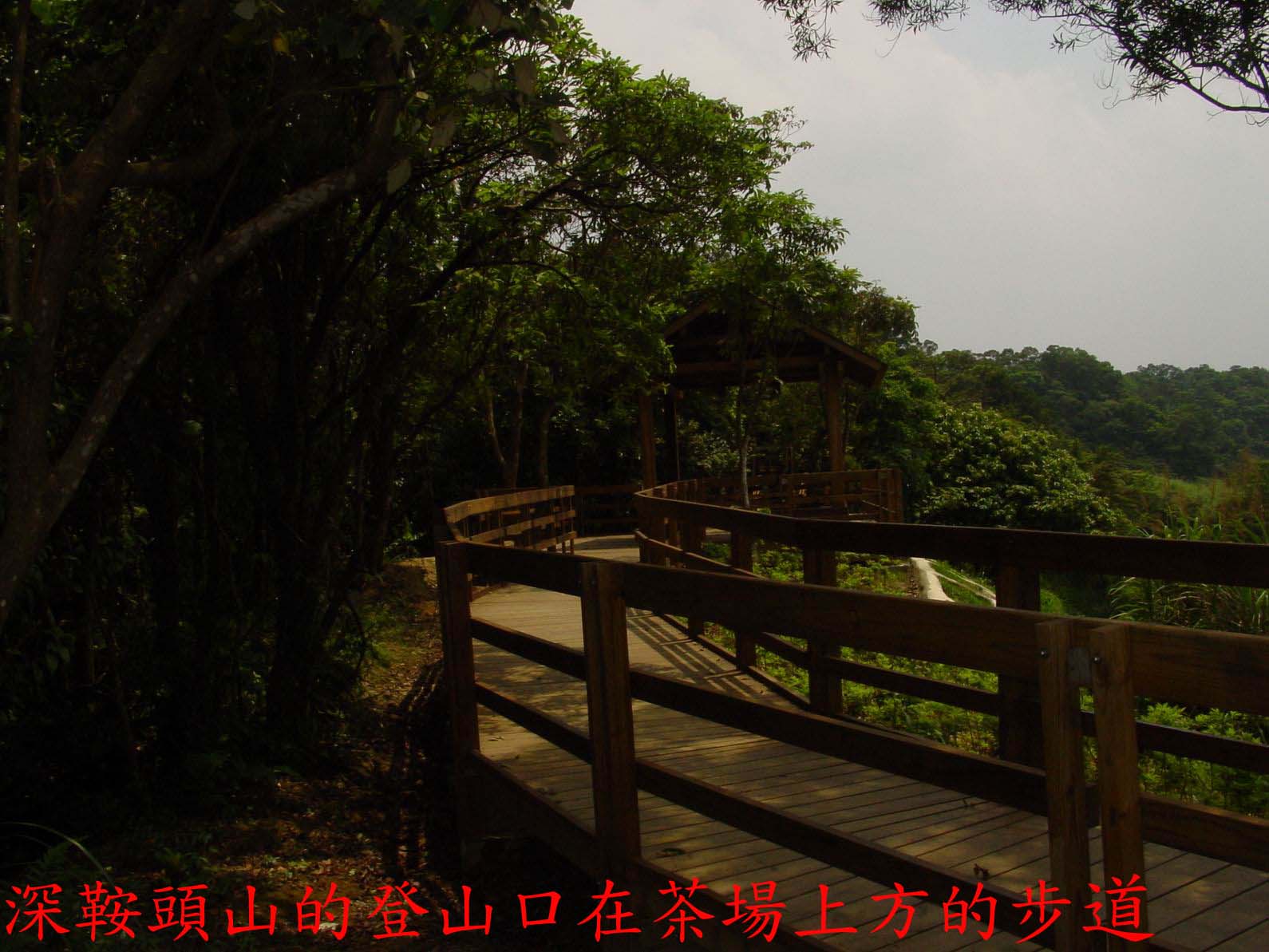 我們左轉走上舊莊街,不久看到登山布條,這是登山口。上去以後,發現前面有茶廠的原木步道,只好跨過欄杆,踏上步道,這條步道相當寬敞,走起來實在舒服。我們在涼亭下休息,在這裡可見到山豬窟尖和上面的高壓電塔,更遠處則是南港山和上面的幾根天線。12:47正好在佔地廣闊,具有金黃色屋頂的茶場的上方,原來這座新建的茶場就在深鞍頭山的山腰處。走完步道後,12:58翻過欄杆,踏上山徑。這條山徑的路跡還算明顯,途中經過兩處高地,一路上都在茂密的樹林內,透進來的陽光顯得細碎,不再曬人,令人感到清涼無比。透過樹葉的縫隙可看到下方排列整齊的的茶園,這裡已是石碇鄉的地界了。1:15進入竹林,1:16看到了基點。旁邊三個類似的指示牌上說:「深鞍頭山(糞箕湖山),422M,土調圖根點」,周圍有20片左右的布條,可見這座山還算受歡迎。另一個路標說:「往三層崎山、八分寮山」,這兩座山以前沒聽說過,今天打算去上登十三分山和橫科山,故沒去探險。