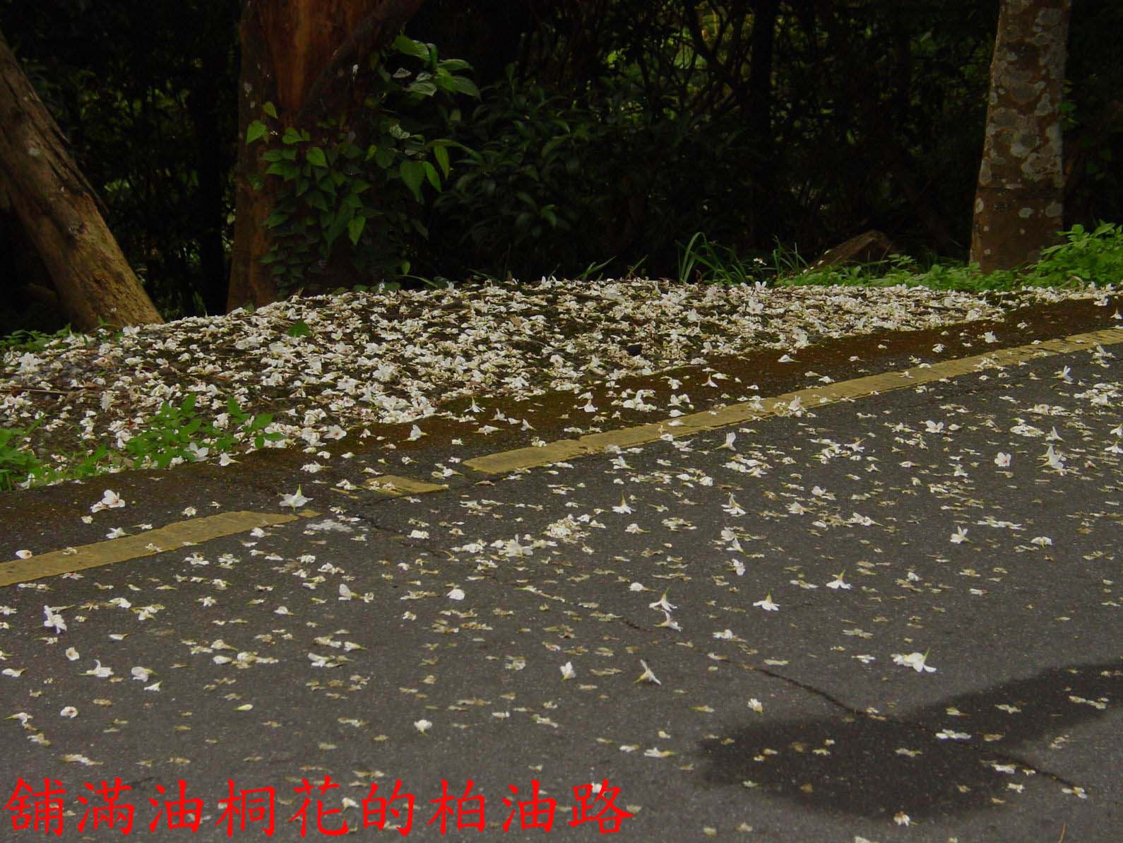 沿途油桐花更多,兩邊白花盛開,這就是有名的五月雪。最近在新竹、苗栗舉辦桐花祭,我們還準備去參加呢,沒想到在這裡就有油桐花。一處柏油路面上舖滿掉落下來的花,令人感覺到有如在夢境中,油桐花一片一片飄落下來的景象有一點悽美的感覺。3:35經過一根編號為B8040/G882的電線桿,這裡是我熟知的登山口,這個地方是一個山谷,高壓電線從附近通過,路旁山邊有漂亮的住家,另外還有一條寬闊的泥路通往上方。我們走上去,沿著房舍欄杆旁邊的石頭階梯上去,但山路不明顯,而且也見不到登山布條了,不敢再深入。我以前都是由這裡上去,高壓電線就在右邊上方,不費力氣也不必找路,藉登山布條的指引就順利的抵達鞍部,右轉上去就可找到基點。幾年沒來,地貌和植物已完全改變,找不到路上去,只好再回到柏油路上。