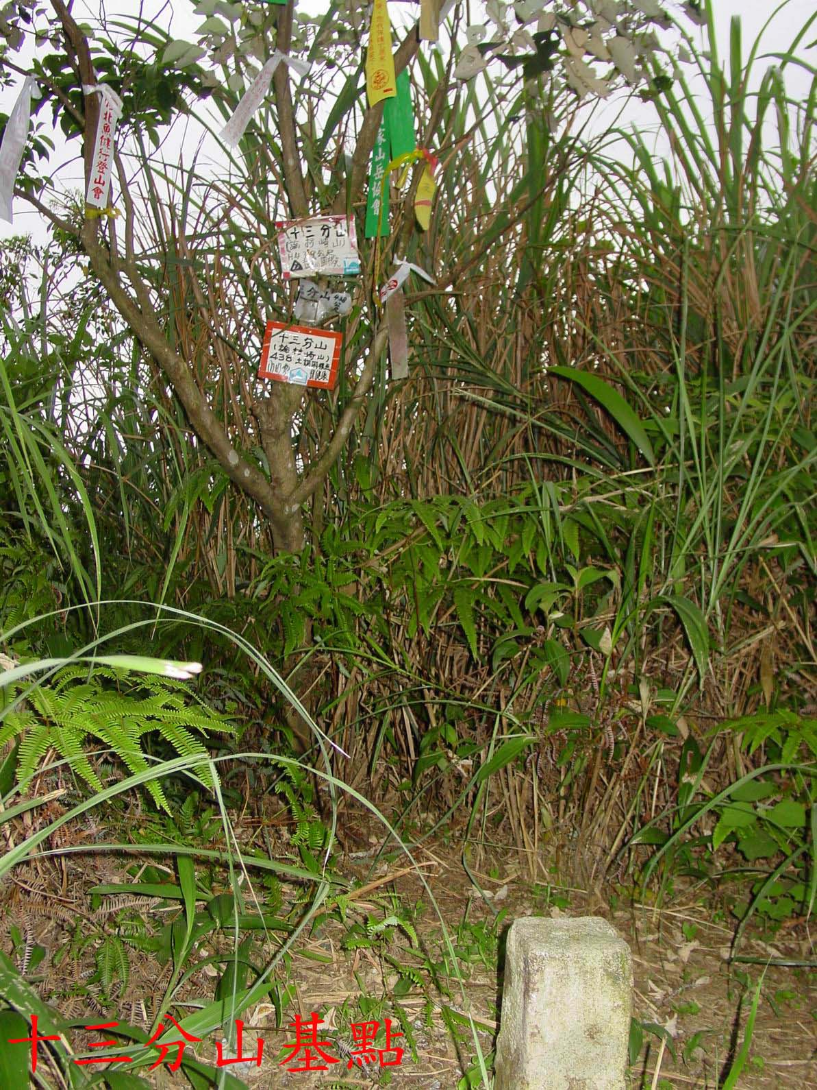 這次沿著剛才提到的泥路往上走。這條路約有三公尺寬,我以為通往鞍部,沒想到終點卻是蔡氏墓園。這裡離鞍部已不遠了,現在已有那麼寬闊的泥路,難怪原有的小徑就沒人再走,以致完全掩沒在雜草和樹林中間了。我們在墳墓右後方找到一條山路,然後鑽進山路。這條路並不好走,兩旁有芒草,雜草也多。4:35終於看到了基點,山水雲設立的指示牌上說:「十三分山(論枋崎山),438,土調圖根點,祝健康。」這裡登山布條約二十幾片,也是受歡迎的郊山,但是展望不好,汐止那邊的景色完全見不到。我們下山,回到蔡氏墓園,發現有一條路往西北方向走,我猜想這是以前走過的前往白雲寺的山路,因為還要去橫科山,就不進去了,仍由寬闊的泥路回到汐碇路,此時是5:10。不久經過文山茶莊岔路口,5:16和5:22兩次通過高壓線下方,這附近有個大型導覽牌指出茶莊和農場的所在。